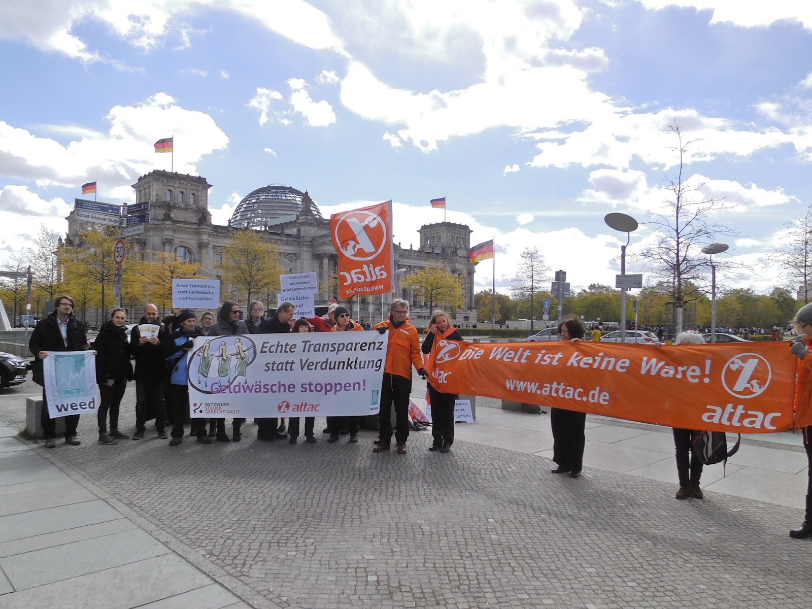 Die Teilnehmer_innen der Aktion appellierten an die Abgeordneten im Bundestag, die notwendigen Nachbesserungen durchzusetzen, um internationale Korruptions- und Geldwäschegeschäfte in Deutschland endlich ernsthaft zu bekämpfen